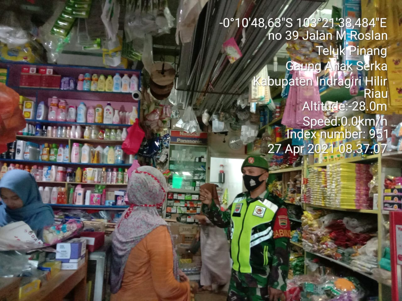 SERIBUPARITNEWS.COM, GAUNG ANAK SERKA - Babinsa Koramil 05/Gas, Kopda Umar Nasution melaksanakan penegakan disiplin protokol kesehatan kepada Pemilik Toko di kelurahan Teluk Pinang kecamatan Gaung Anak Serka Selasa (27/04/2021)