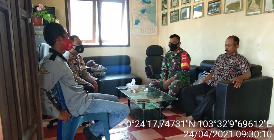 SERIBUPARITNEWS.COM,PULAUBURUNG - Babinsa Koramil 11/Pulau Burung Kodim 0314/Inhil Serda Siswanto dan dan Bhabinkamtibmas melaksanakan komsos dengan perangkat desa Sabtu (24/04/2021)