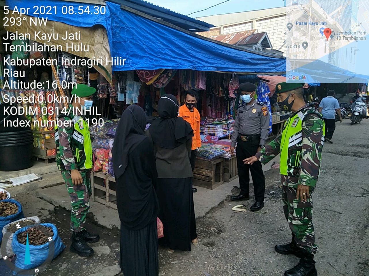 SERIBUPARITNEWS.COM, TEMBILAHAN - Sertu Zulfahri Babinsa Koramil 01/Tembilahan Kodim 0314/Inhil melanjutkan penegakkan disiplin protokol kesehatan di Pasar kayu Jati Kecamatan Tembilahan Hulu Senin (05/04/2021)