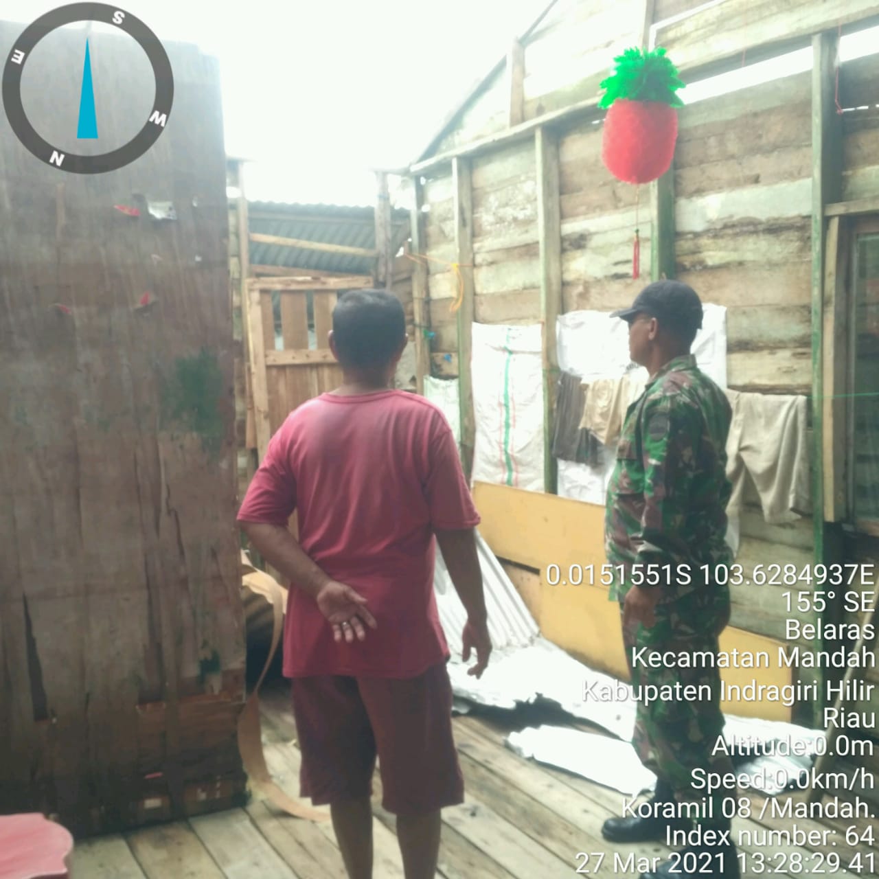 SERIBUPARITNEWS.COM, MANDAH - Gerak Cepat dilakukan Danramil 08/Mandah Kodim 0314/Inhil Kapten Arh.Uwin Suharto  meninjau Warganya yang tertimpa musibah Angin Puting Beliung dini hari tadi di Dusun Peria Desa Belaras Kecamatan Mandah Sabtu (27/03/2021)