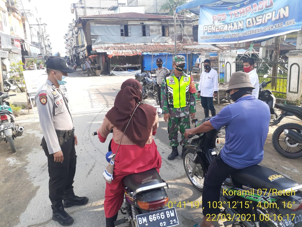 Danramil 07/Reteh Kapten Inf Zainuar. S, menyampaikan bahwa pelaksanaan kegiatan Protokol Kesehatan merupakan tugas rutin yang dilaksanakan Babinsa bersama Anggota Polsek Reteh, Sat Pol PP dan Relawan, lebih lanjut disampaikan Danramil bahwa dalam pelaksanaan penegakan disiplin Protokol Kesehatan dilakukan secara persuasif dengan menerapkan edukasi kepada masyarakat.