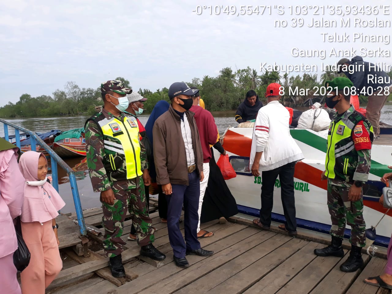 SERIBUPARITNEWS.COM, Babinsa  Koramil 05/Gas kodim 0314/Inhil  dipimpin  Serka Sasmito  melaksanakan Penegakan Disiplin Protokol  Kesehatan kepada penumpang sped boat  di Pelabuhan Penumpang Teluk Pinang Kecamatan Gaung  Anak Serka Senin (08/03/2021)