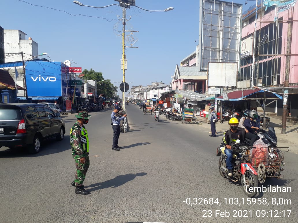 SERIBUPARITNEWS.COM, TEMBILAHAN - Serda Deni Sutrisno Babinsa Koramil 01/Tembilahan Kodim 0314/Inhil  Melaksanakan Penegakkan Disiplin di Bundaran Simpang Tiga Kecamatan Tembilahan Selasa  (23/02/2021)