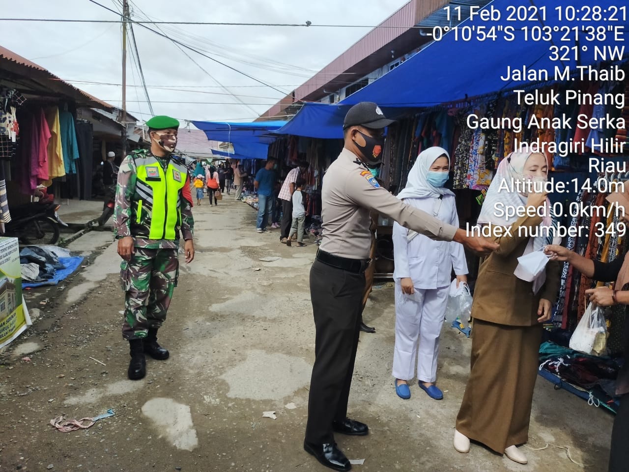 Serda Jondlis Panggabean Babinsa Lahang Hulu Koramil 05/Gas Kodim 0314/Inhil Membagikan masker kepada pedagang dan Pengunjung di pasar tersebut