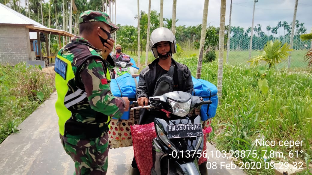 SERIBUPARITNEWS.COM, GAUNG ANAK SERKA - Babinsa Koramil 05/Gaung Anak Serka Kodim 0314/Inhil Praka Nico melaksanakan Gakplin kepada Para Pedagang Keliling di Desa Teluk Tuasan Kecamatan Gaung Anak Serka Senin (08/02/2021)