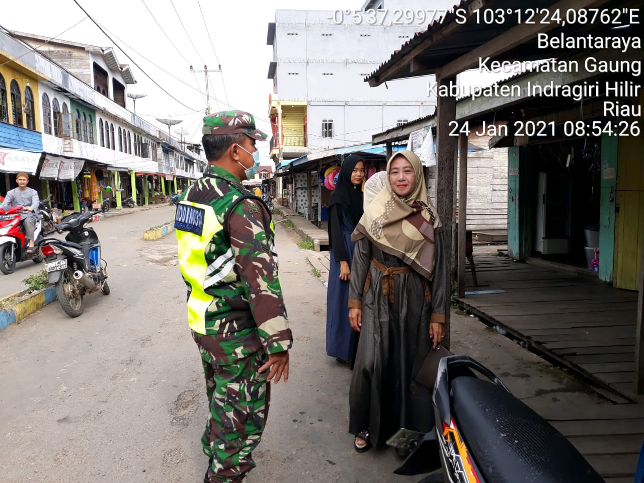 Dalam Kegiatan Penegakkan Disiplin tersebut Serka Sasmito Menghimbau  memakai masker kepada warga yang berjalan kaki di Desa Belantaraya