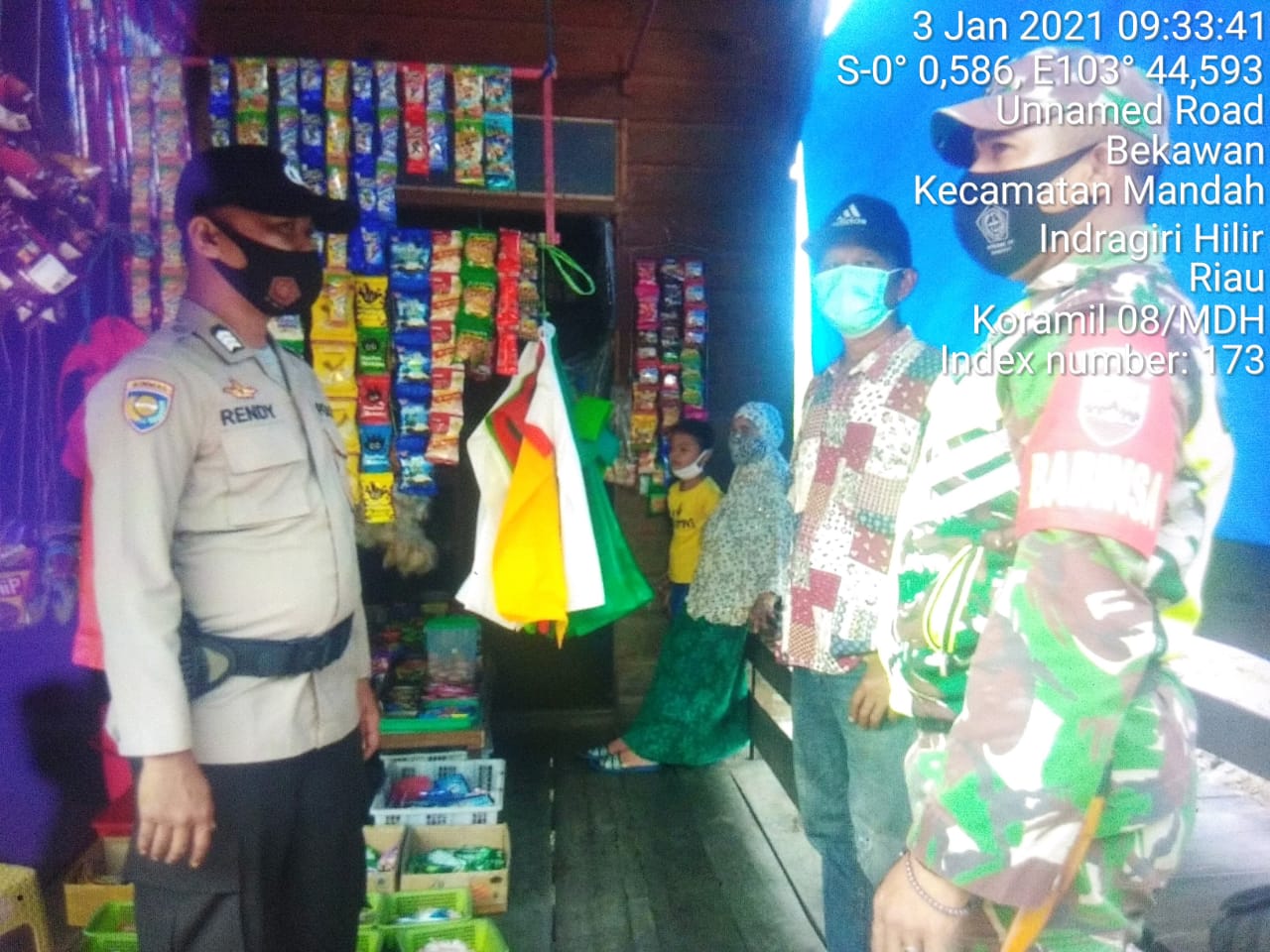 SERIBUPARITNEWS.COM, MANDAH - Babinsa Koramil 08/Mandah Kodim 0314/Inhil Serda Haris Moni Melaksanakan Gakplin bersama Babinkamtibmas kepada masyarakat yang berada di pasar Desa Bekawan Kecamatan Mandah Kab. Inhil Minggu (03/01/2021)