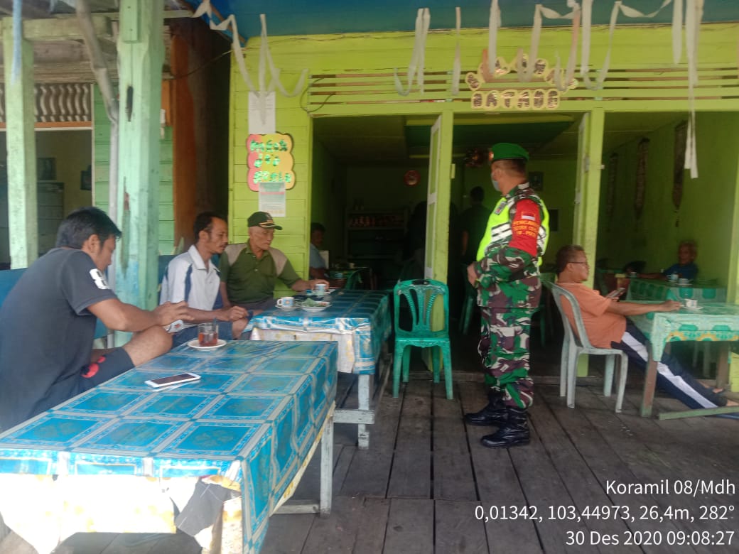 SERIBUPARITNEWS.COM,MANDAH - Babinsa Koramil 08/Mdh.Koptu Adlis Melaksanakan Gakplin Covid -19 kepada para pengunjung di Warung Kopi Pasar Mandah Kel.Khairiah Mandah Kecamatan Mandah Kab. Inhil Rabu (30/12/2020)