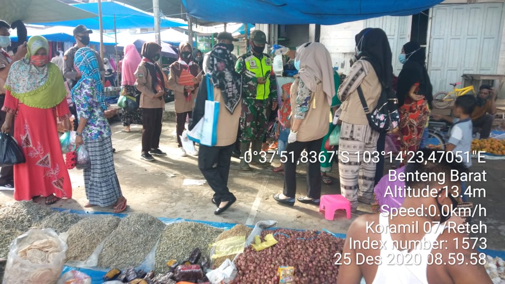 SERIBUPARITNEWS.COM,Benteng,"-Personil Bintara Pembina Desa (Babinsa) Koramil 07/Reteh jajaran Kodim 0314/Inhil melaksanakan kegiatan sosialisasi dan penegakan disipilin protokol kesehatan Covid-19 yang dilaksanakan di Pasar Tradisional  Kelurahan Benteng Kecamatan Sungai Batang Kabupaten Inhil, Jum'at (25/12/2020).
