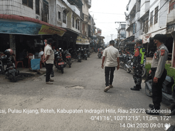 SERIBUPARITNEWS.COM,RETEH - Babinsa Koramil 07/Reteh Kodim 0314/Inhil bersama tem gabungan Satgas Covid 19 kecamatan Reteh  yang terus beroprasi di tempat keramaian ,pasar dan di jalan - Jalan Rabu (14/10/2020).