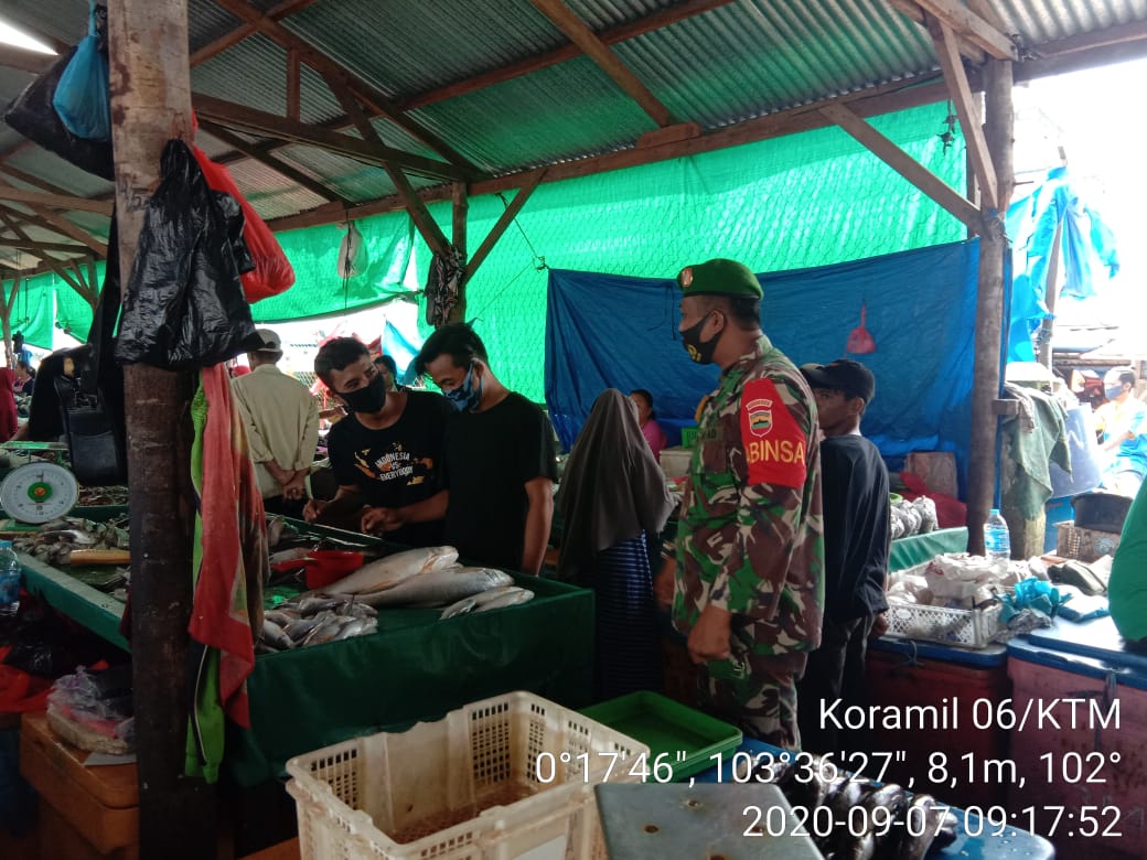 Pedagang dan pengunjung pasar pagi sungai guntung Kec.Kateaman menjadi sasaran penegakkan disiplin oleh Babinsa koramil 06/kateman