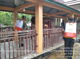 SERIBUPARITNEWS.COM,MANDAH - Babinsa Koramil 06 Kateman Serda Erik Arianto Sibarani melaksanakan kegiatan penyemprotan desinfektan Jumat (19/06/2020)