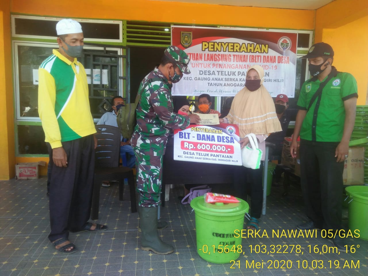 Babinsa Teluk Pantsian  Koramil 05/Gas Serka Nawawi menghadiri penyaluran BLT Bansos di Desa Teluk Pantaian   Kec. Gaung Anak Serka  Kamis,21/05/2020 pagi.