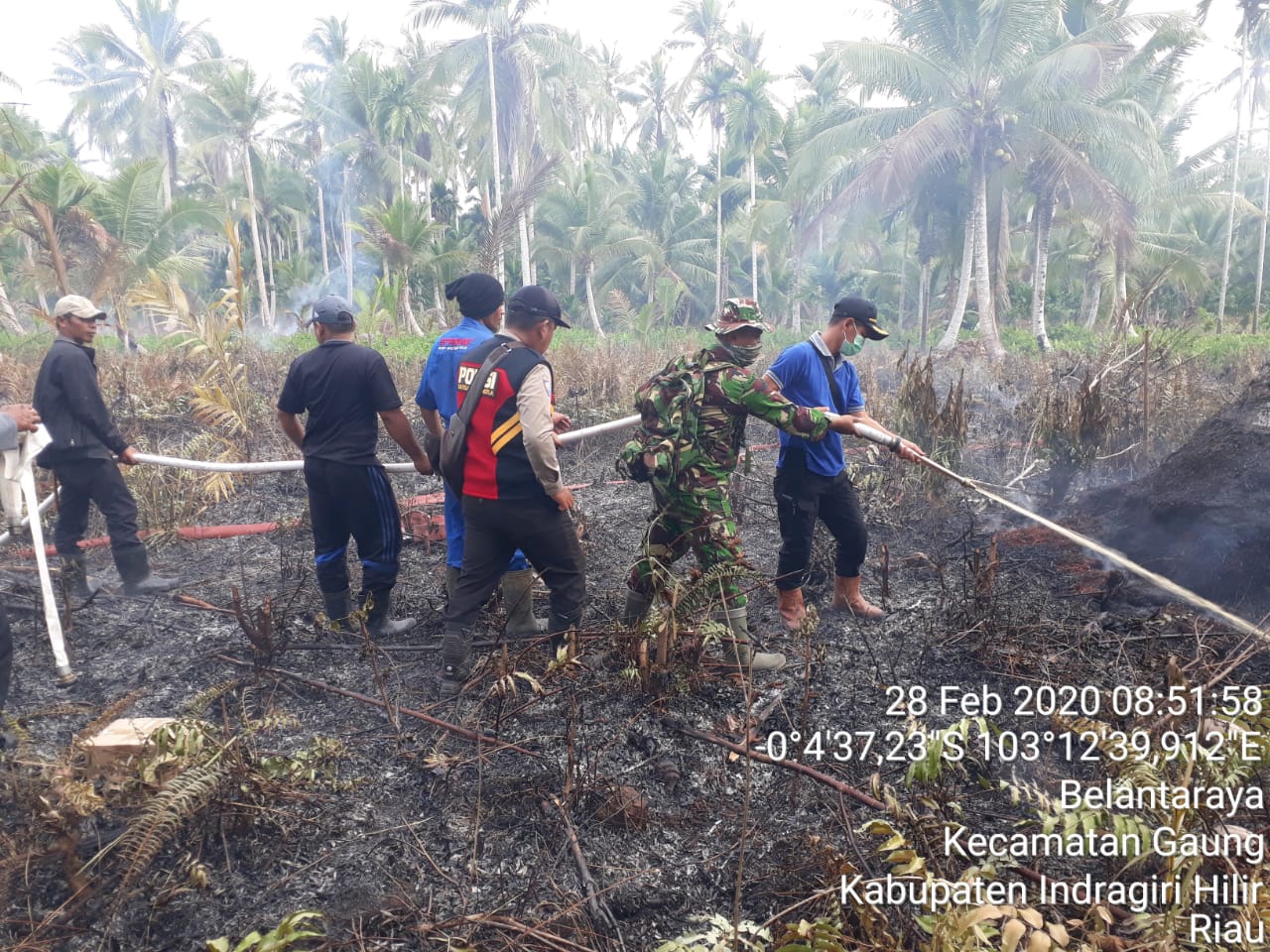 Babinsa Belantaraya Koramil 05/Gas Serka Sasmito berjibaku padamkan api bersama Bhabinkamtibmas, MPA, masyarakat di Dusun Kempas Jaya Desa Belantaraya Kecamatan Gaung Kab. Inhil, Jum,at,28/02/2020.