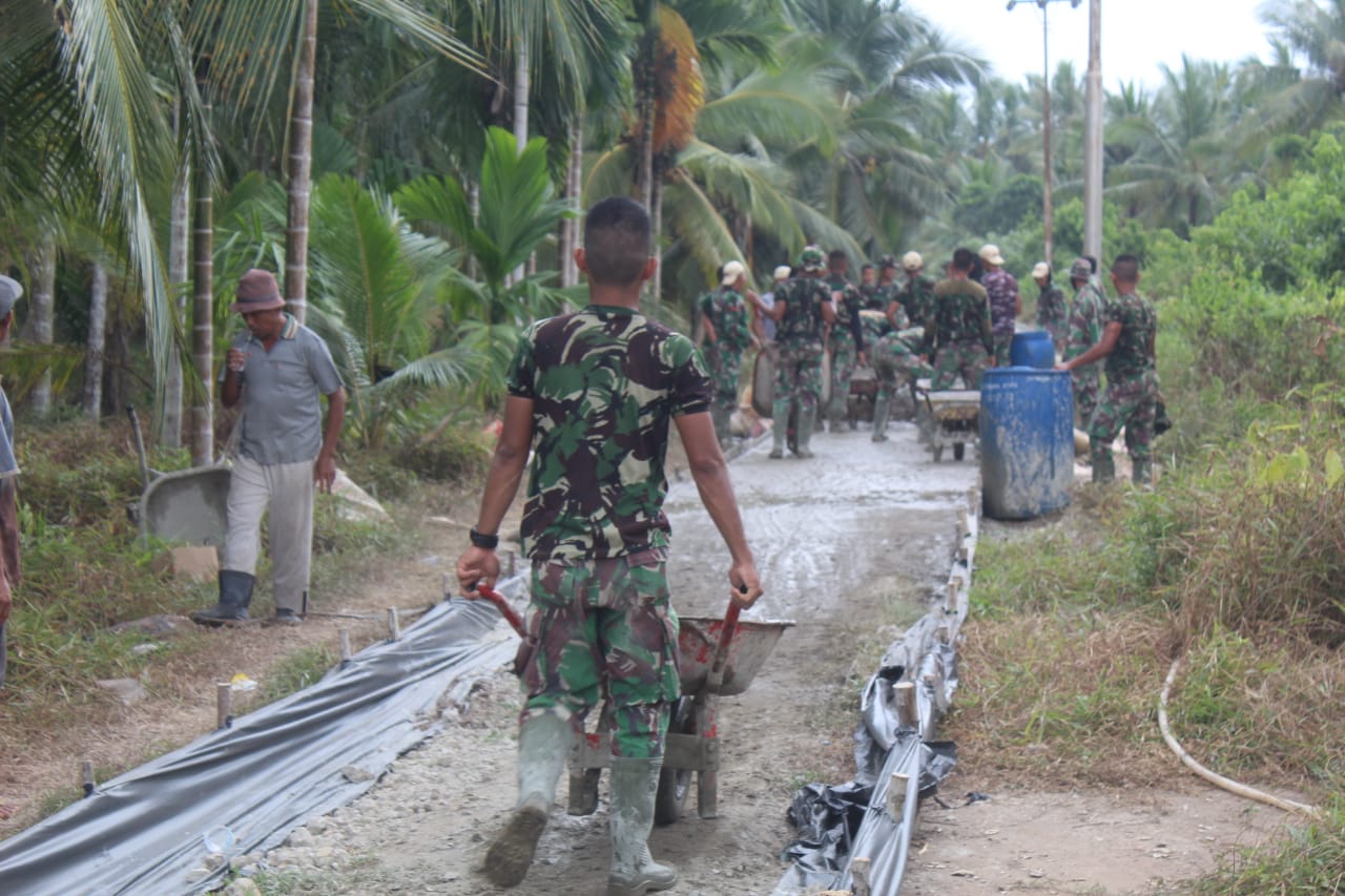 Tanpa kenal lelah Anggota satgas TMMD ke 111 kodim 0314/inhil bersama masyarakat kejar target pengerjaan semenisasi jalan.