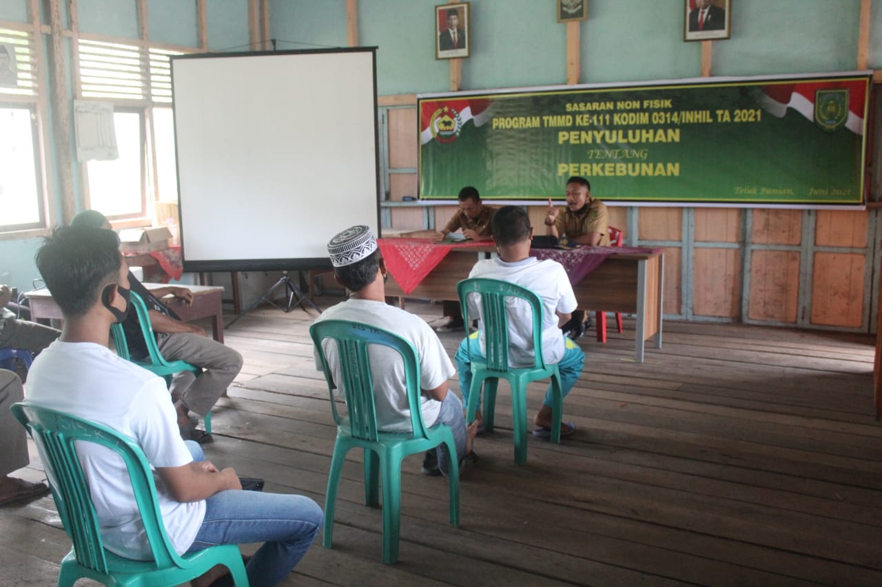 Hari ini Satgas TMMD ke 111 Kodim 0314/lnhil menggandeng dinas perkebunan Kabupaten lnhil untuk menyelenggarakan penyuluhan tentang perkebunan ataupun pertanian di gedung Sekolah Dasar 005 Desa Teluk Bunian. Jum'at, (09/07/2021).