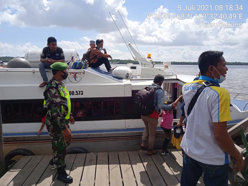 SERIBUPARITNEWS.COM, PULAUBURUNG - Babinsa Koramil 11/Pulau Burung  Serda Supandi Jaya melaksanakan Kegiatan Penegakkan Disiplin  Protokol Kesehatan Covid-19 di Pelabuhan Marina Di Desa Pulau Burung Kecamatan Pulau Burung Kab Inhil Senin (05/07/2021)