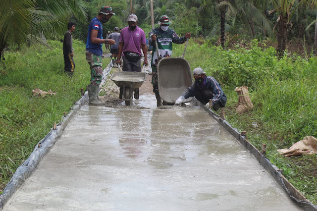 Cuaca pagi yang dihiasi dengan gerimis, tidak menyurutkan semangat anggota Satgas TMMD ke 111 Kodim 0314/lnhil bersama masyarakat dalam bergotong royong