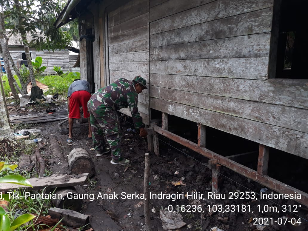 SERIBUPARITNEWS.COM, GAUNG ANAK SERKA - Babinsa Koramil 05/Gas, Serka Eddy Hartono  melaksanakan kegiatan bedah rumah pemasangan pasang tiang  dan GRC bersama warga di Desa Teluk Pantaian  Kecamatan Gas,  Kab Inhil Minggu (04/07/2021)
