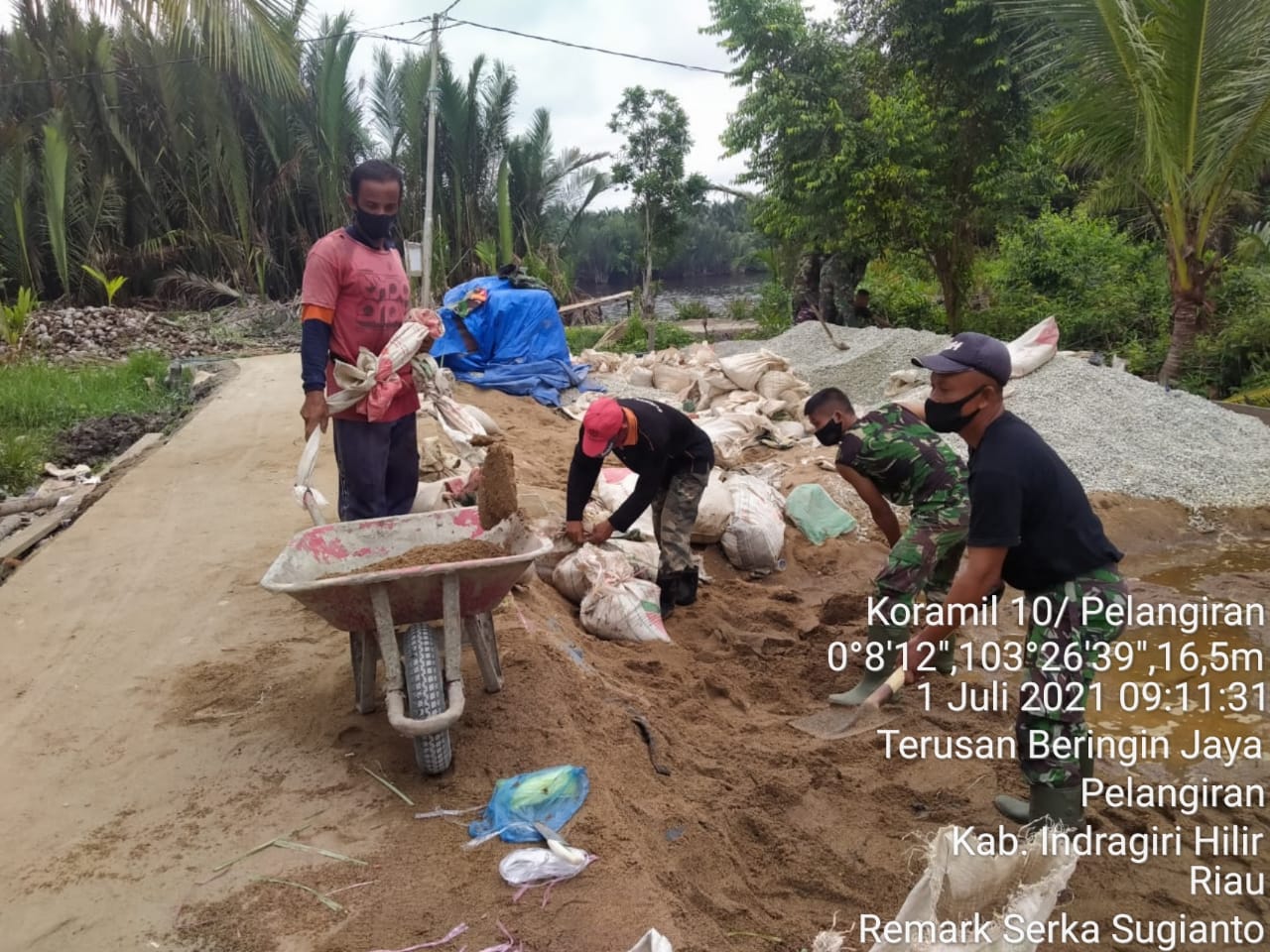 SERIBUPARITNEWS.COM,PELANGIRAN - Babinsa Koramil 10/Pelangiran Serka Sugianto melaksanakan terus menggesa semenisasi jalan  bersama warga di Desa Terusan beringin jaya  Kecamatan Pelangiran ,Kab.Inhil Kamis (01/07/2021)