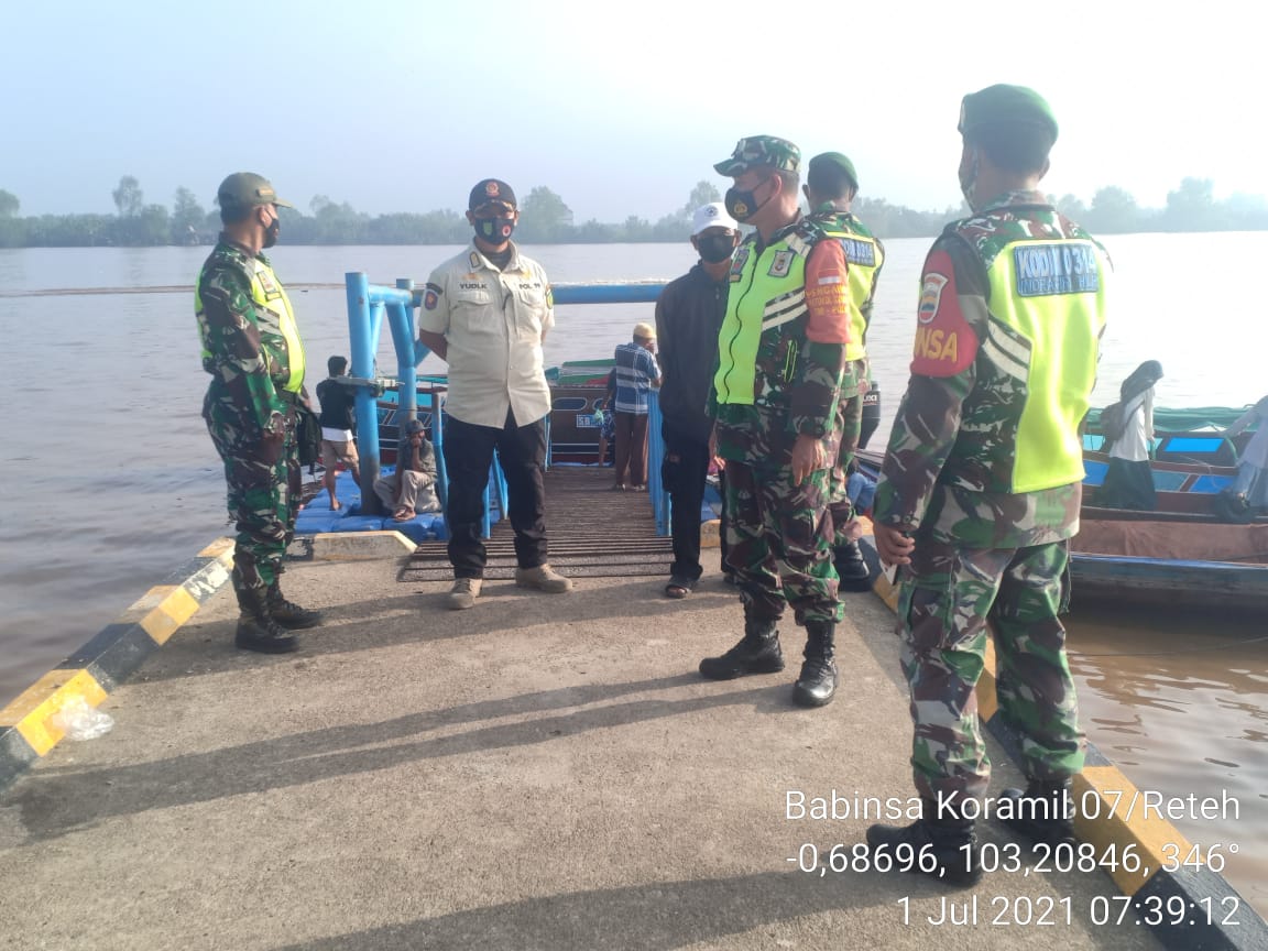 SERIBUPARITNEWS.COM,Pulau Kijang," – Dalam menekan angka penularan Covid-19 di Wilayah Babinsa Koramil 07/Reteh, bersama team Gugus tugas Kecamatan Reteh  melakukan pemantauan Pelabuhan dan pasar tradisional,Kamis, (01/07/21).