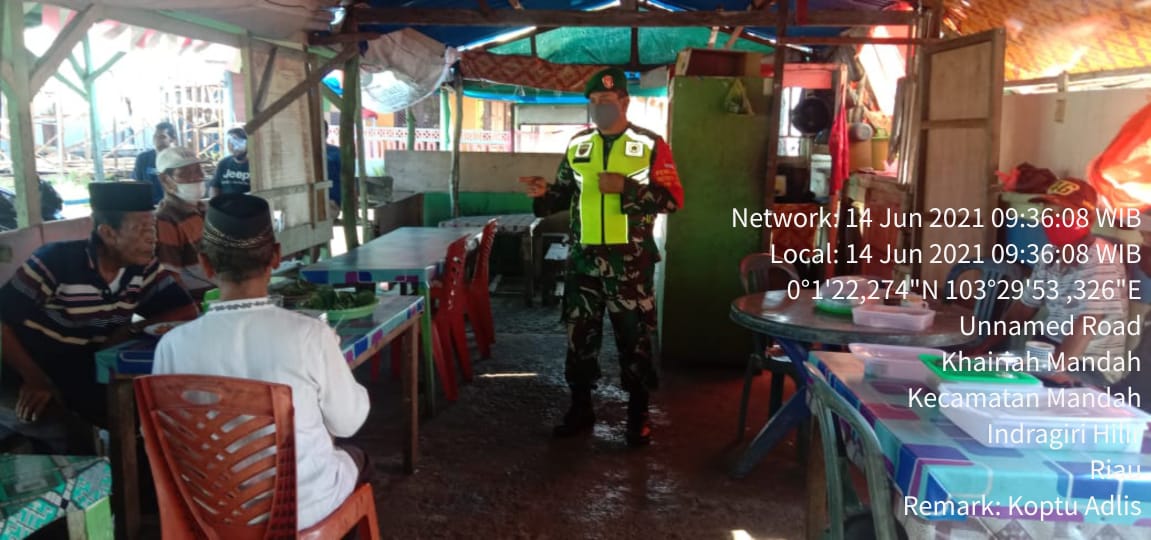SERIBUPARITNEWS.COM,MANDAH - Babinsa Koramil 08/Mandah Koptu Adlis melaksanakan penegakan disiplin protokol Kesehatan Covid kepada warga pengunjung warung kopi Senin (14/06/2021)